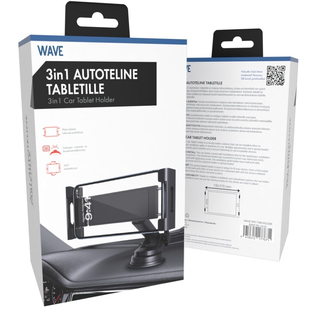 Wave 3in1 Autoteline Tabletille on tukeva telineratkaisu, jonka voi kiinnittää niin auton kojelautaan, ilmastointiritilään, kuin myös istuimen niskatukeen. Kattavat säädöt ja jousitoiminen pidikeosa takaavat hyvän