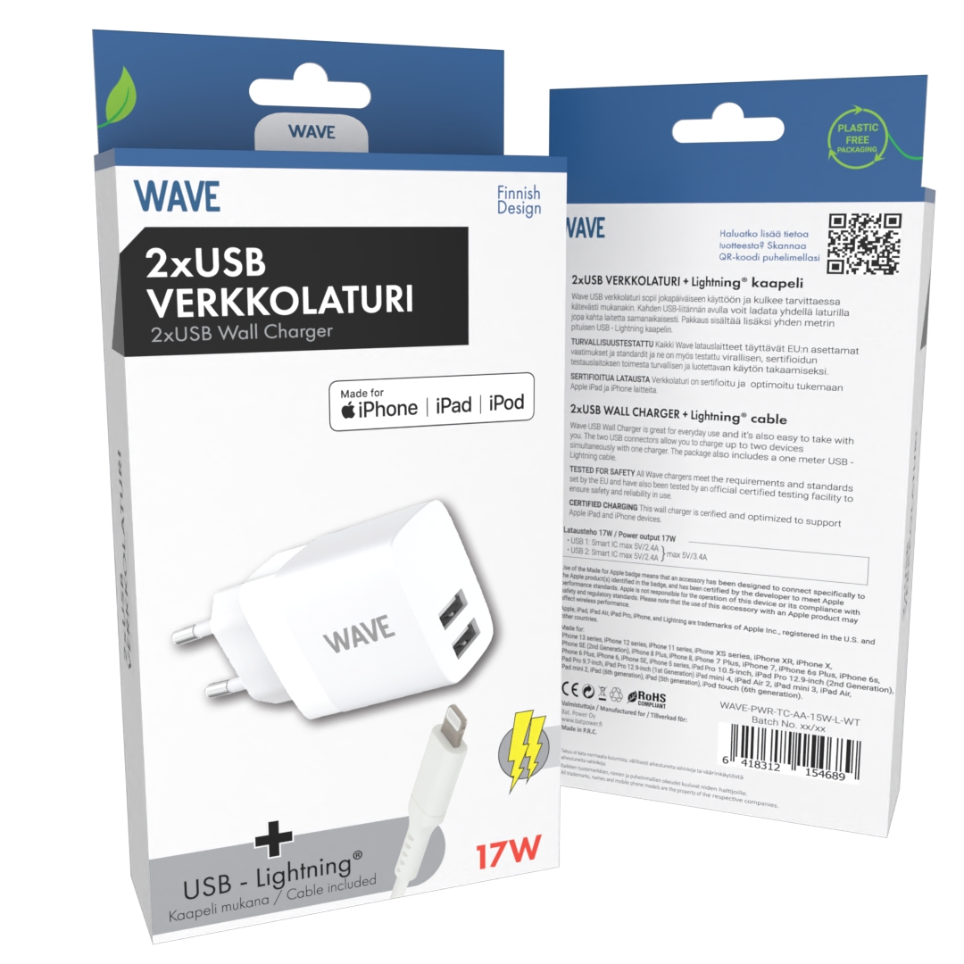– Myyntipakkauksen sisältö: Wave verkkolaturi, Apple Lightning MFI -> USB 2.0 -kaapeli (1m)