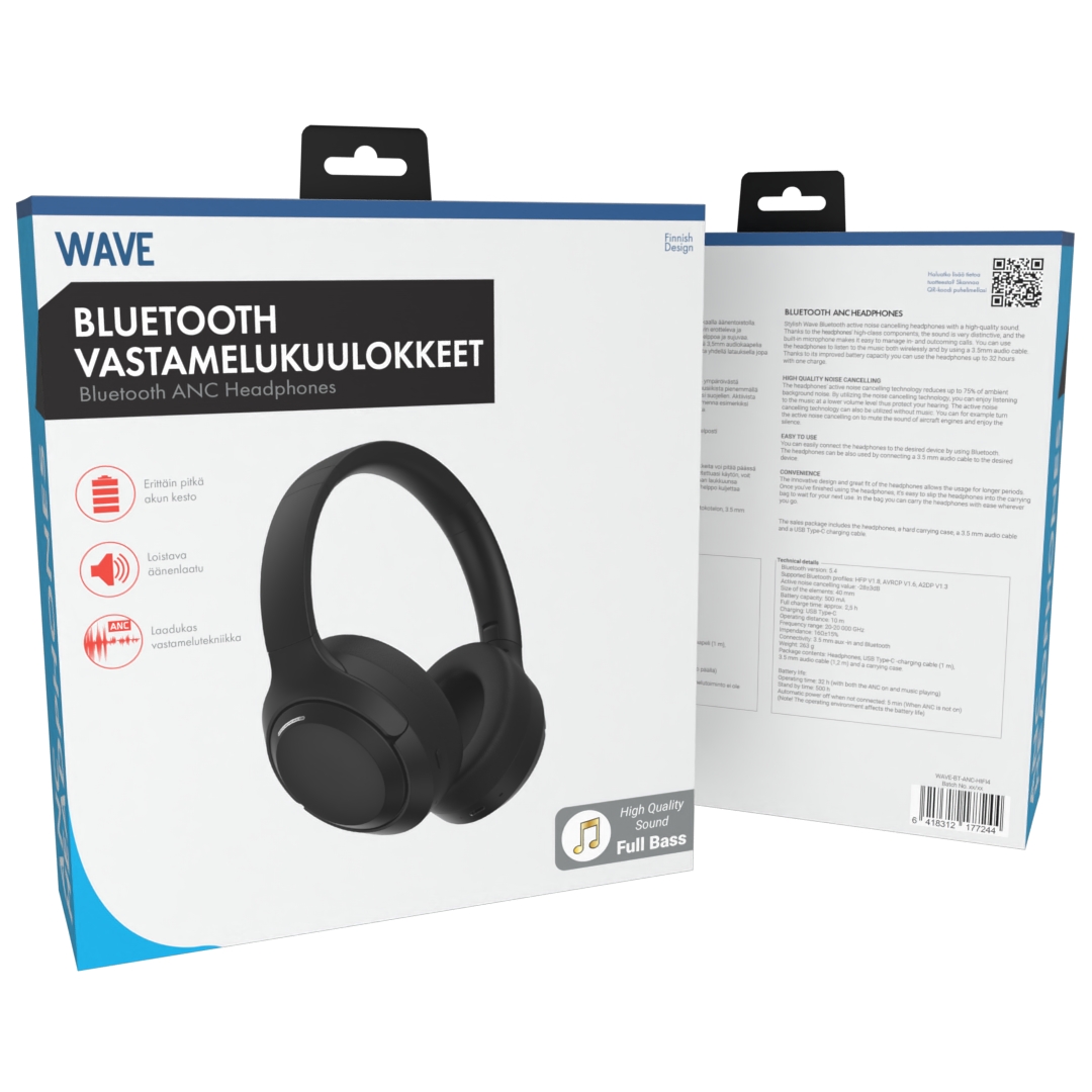 – Myyntipakkauksen sisältö: Wave Bluetooth 5.4 vastamelukuulokkeet, USB Type-C -> USB 2.0 -kaapeli (30 cm), 3,5mm audiokaapeli (1,2 m), suojakotelo kuulokkeille ja pikakäyttöopas