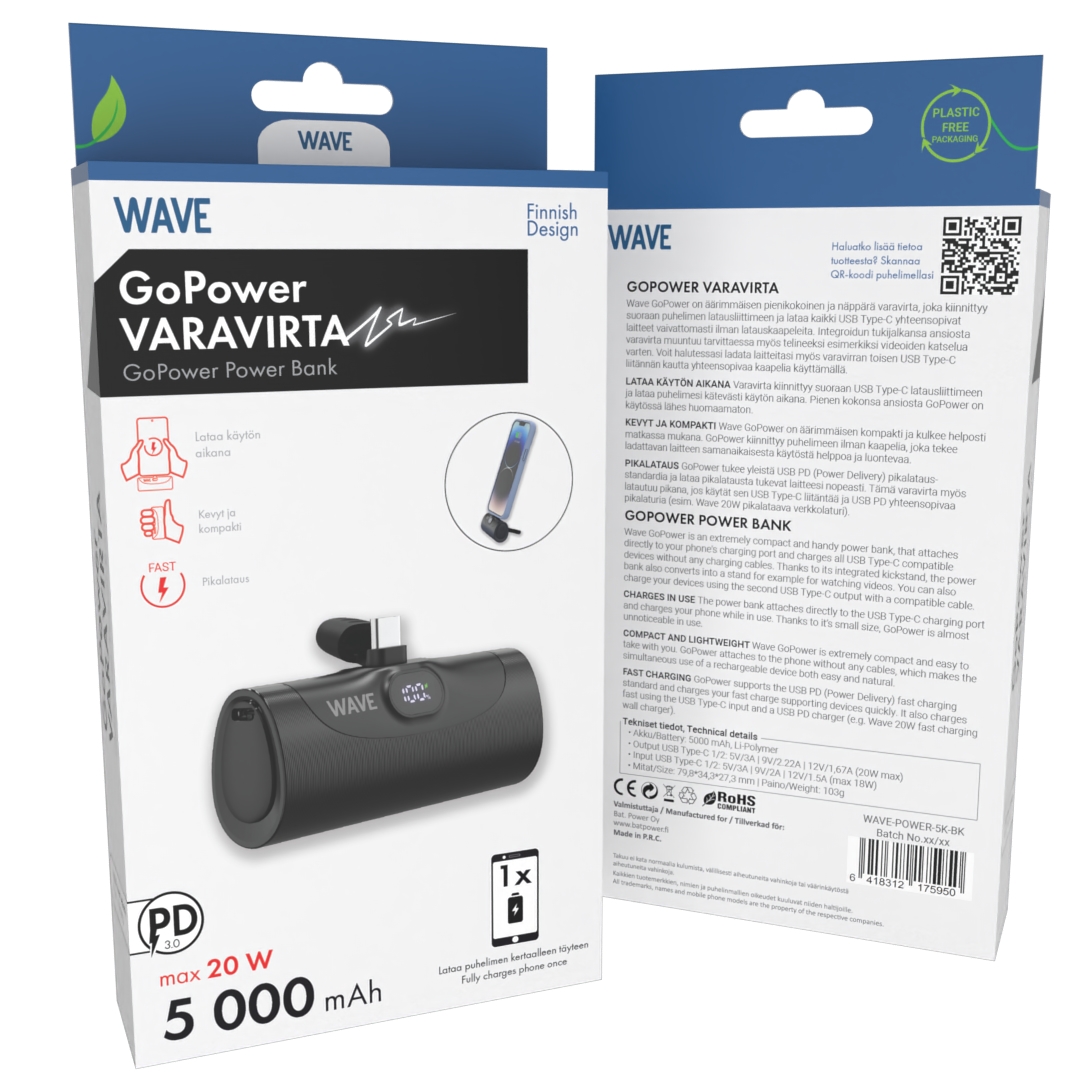 Wave GoPower on äärimmäisen pienikokoinen ja näppärä varavirta, joka kiinnittyy suoraan puhelimen latausliittimeen ja lataa kaikki USB Type-C yhteensopivat laitteet vaivattomasti ilman latauskaapeleita. Integroidun tukijalkansa ansiosta varavirta muuntuu tarvittaessa myös telineeksi esimerkiksi videoiden katselua varten. Voit halutessasi ladata laitteitasi myös varavirran toisen USB Type-C liitännän kautta yhteensopivaa kaapelia käyttämällä.