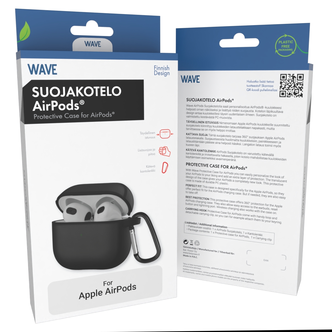 – Myyntipakkauksen sisältö: Wave AirPods -suojakotelo (Musta) ja metallinen kiinnityshakanen (Musta)