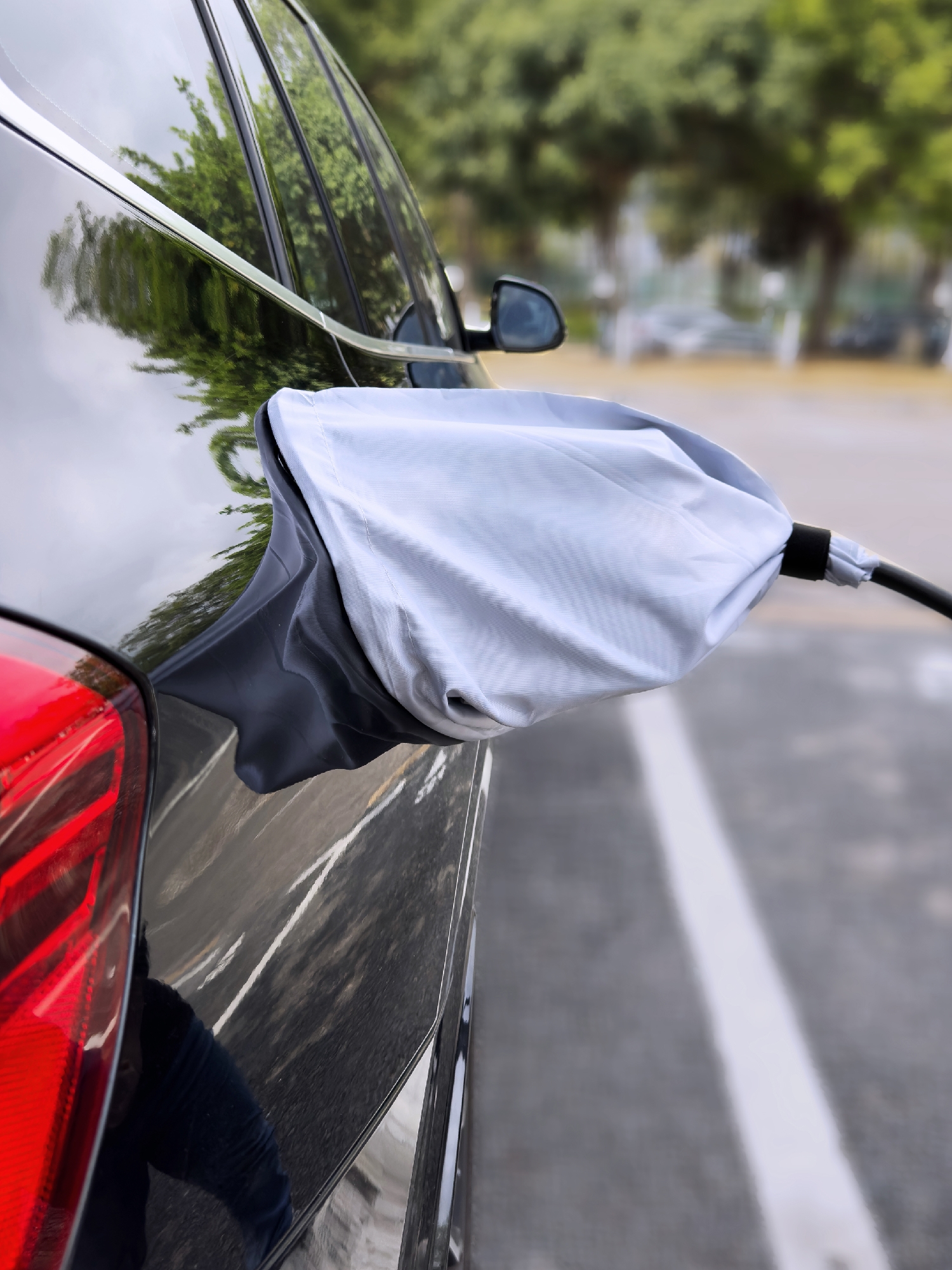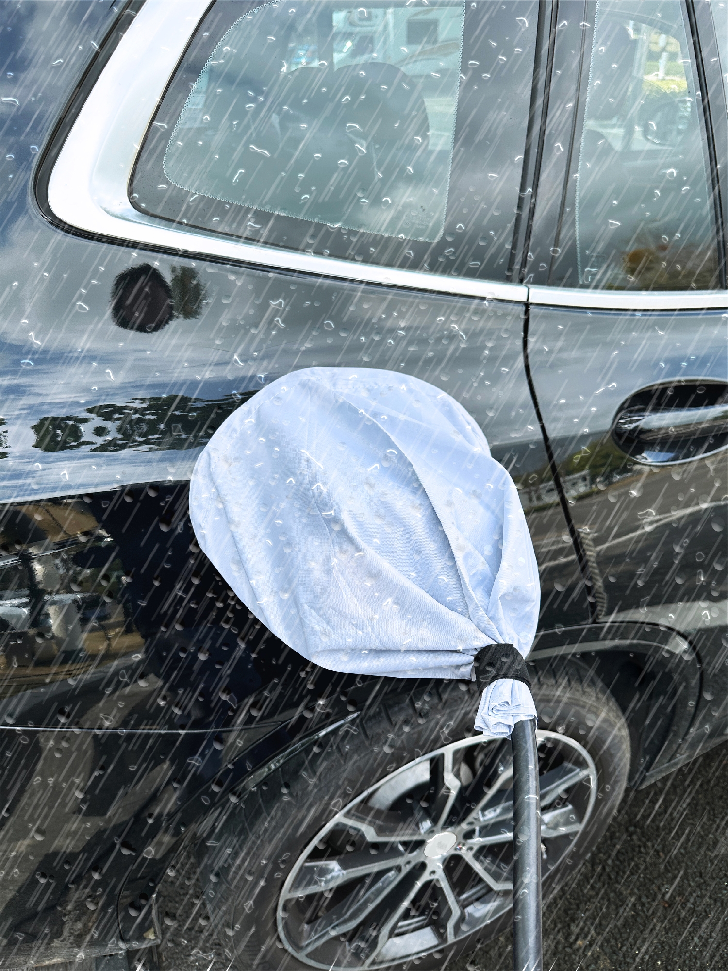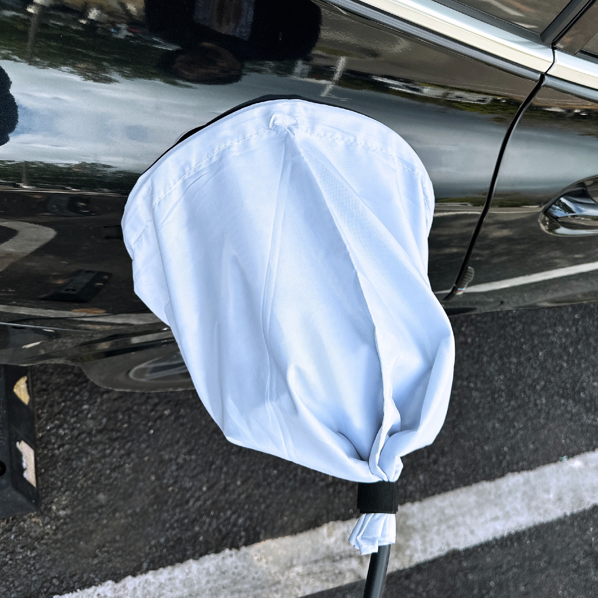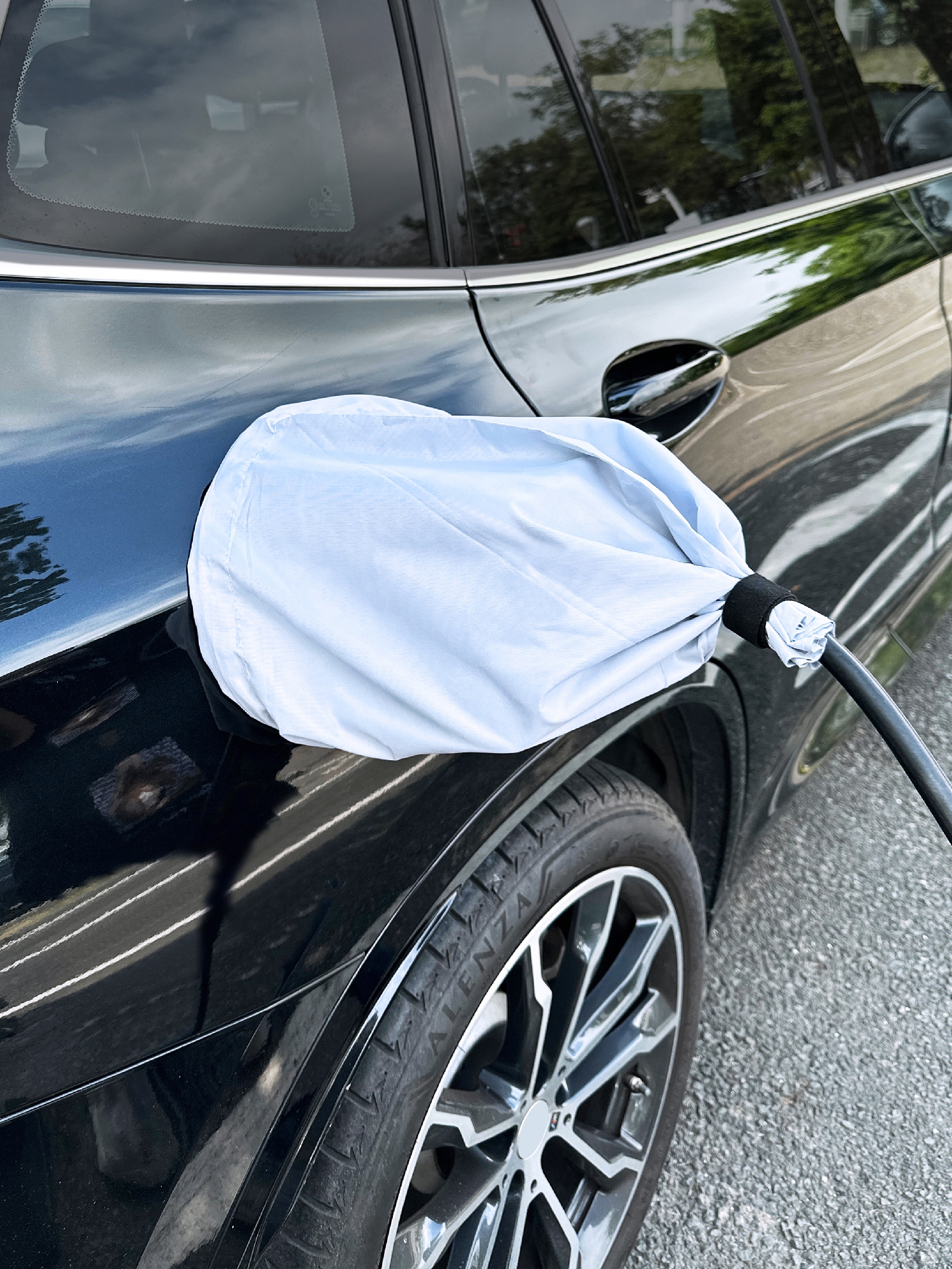 Suoja on helppo kiinnittää auton latausluukun ympärille sisään ommellun magneettinsa avulla. Magneetin ja kiristysnauhan avulla saat suojattua autosi latauspistokkeen aukottomasti.