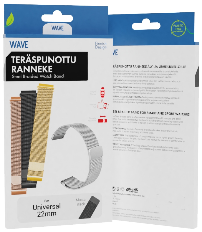 Wave Teräspunottu ranneke on muodikas vaihtoranneke äly- ja urheilukelloille. Ranneke sopii ajattoman tyylinsä puolesta niin arkeen kuin juhlaan ja kestää laadukkaiden materiaaliensa ansiosta loistavasti kovempaakin käyttöä.